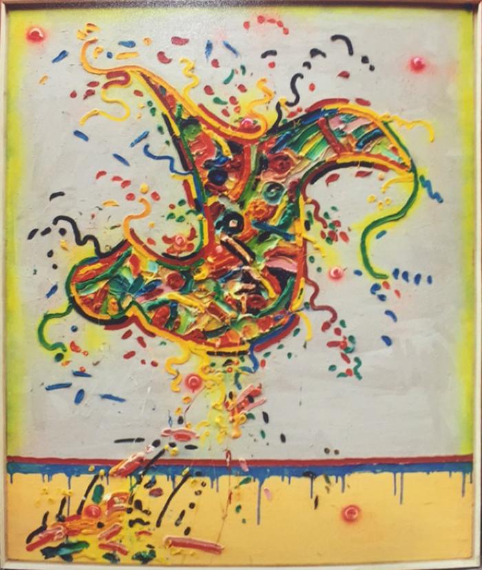 A highly textured abstract painting exemplifying the complementary colours of yellow and purple... Savannah's attempt at describing an abstract piece